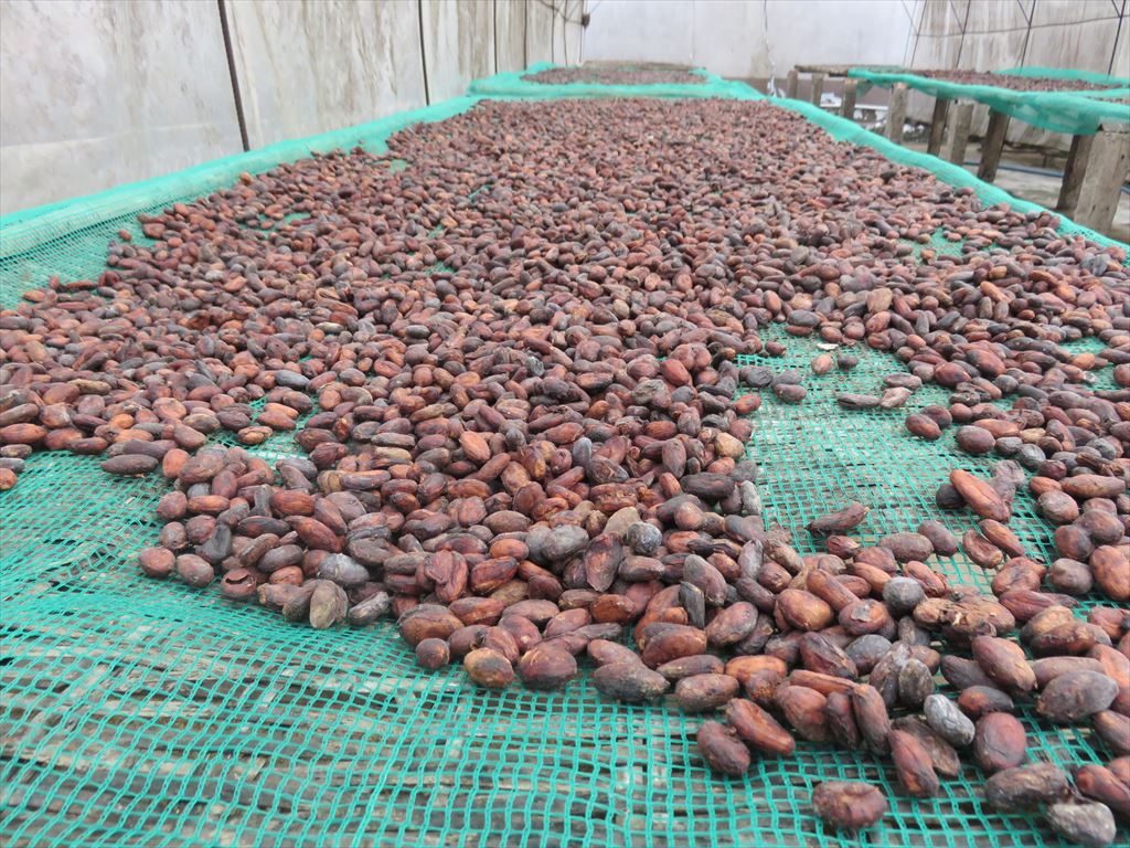 右側の窓ガラスがある建屋は事務所で左側に白いビニールの屋根下にカカオ豆を乾燥するテーブルが見えます。